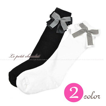 靴下 ダブルリボン チェック ハイソックス ブラック 黒 ホワイト 白 全2色 子供 ベビー キッズ ジュニア 女の子 メール便 送料無料 【あす楽】